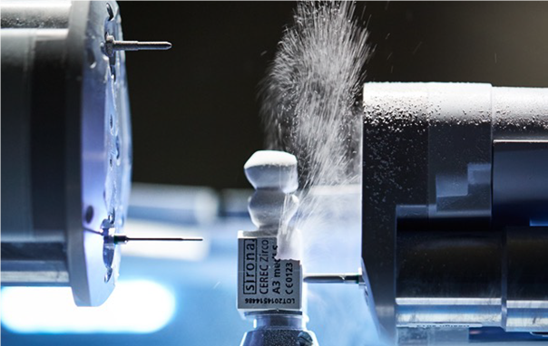 Diese Daten werden an eine separate Schleifmaschine gesendet (Abb. 4) und nach etwa 5-15 Minuten ist der fertige keramische Zahnersatz (Abb.5) aus einem industriell gefertigtem Keramikblock ausgeschliffen(Abb. 6). Die fertig ausgeschliffene Keramikrestauration kann nach einem Glanzbrand und anschließender Endkontrolle direkt eingesetzt werden (Abb. 7 & 8).